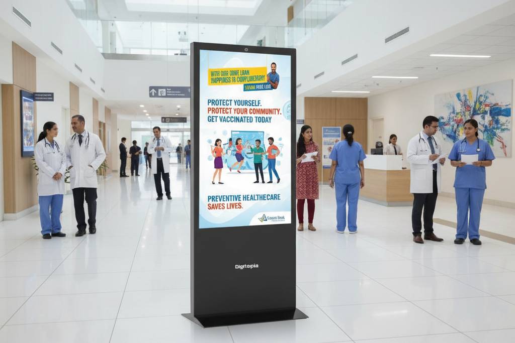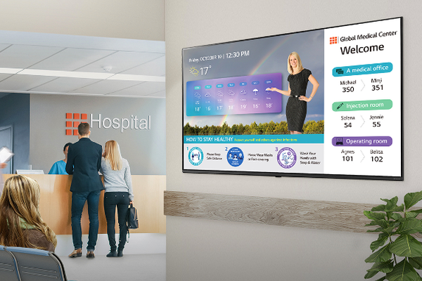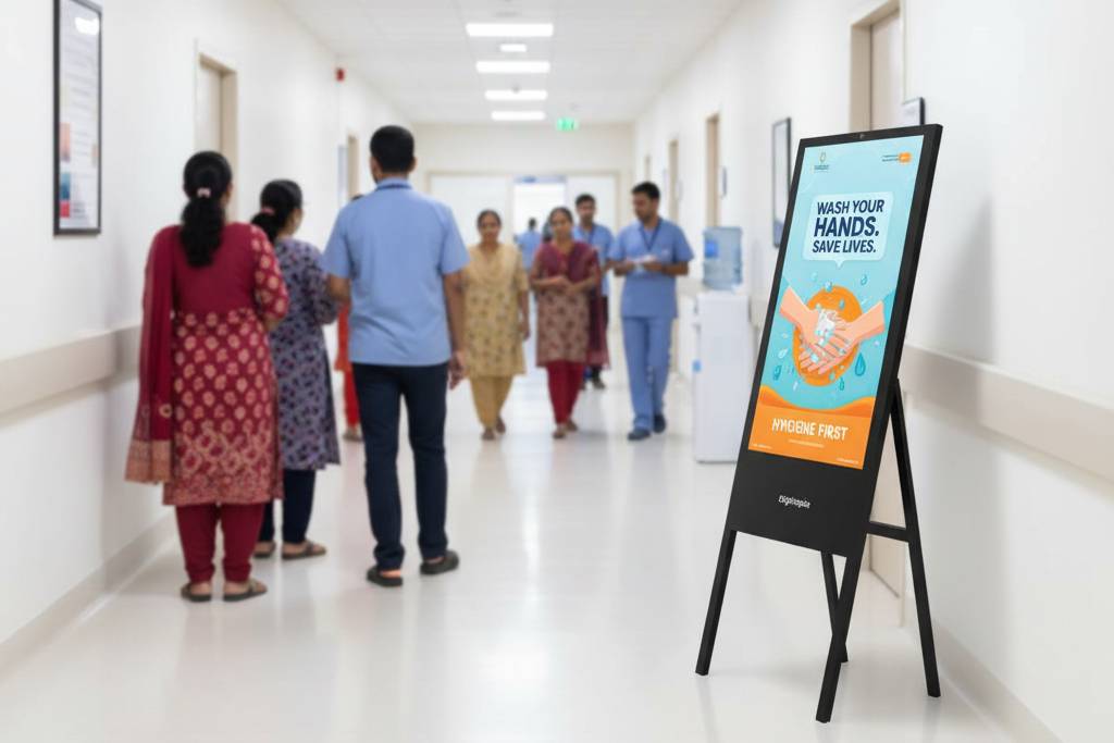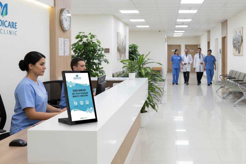 Displays switch to health tips, service promos, or procedural guidance suited to the audience