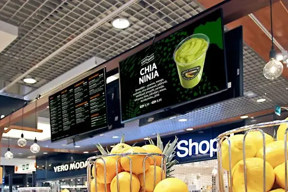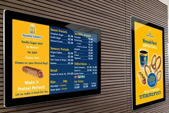 Indoor screens adapt menus based on time of day, customer type, and group size.